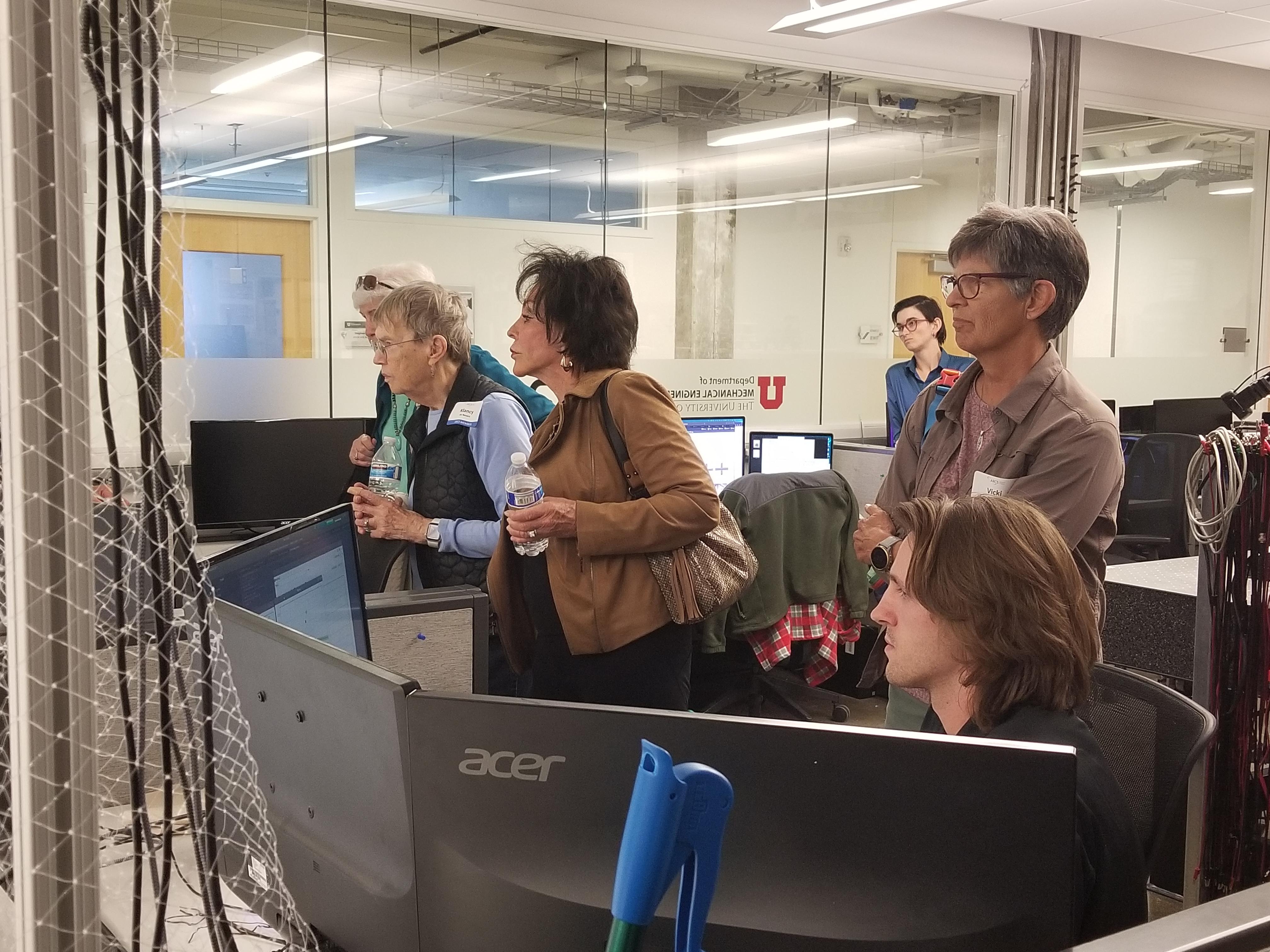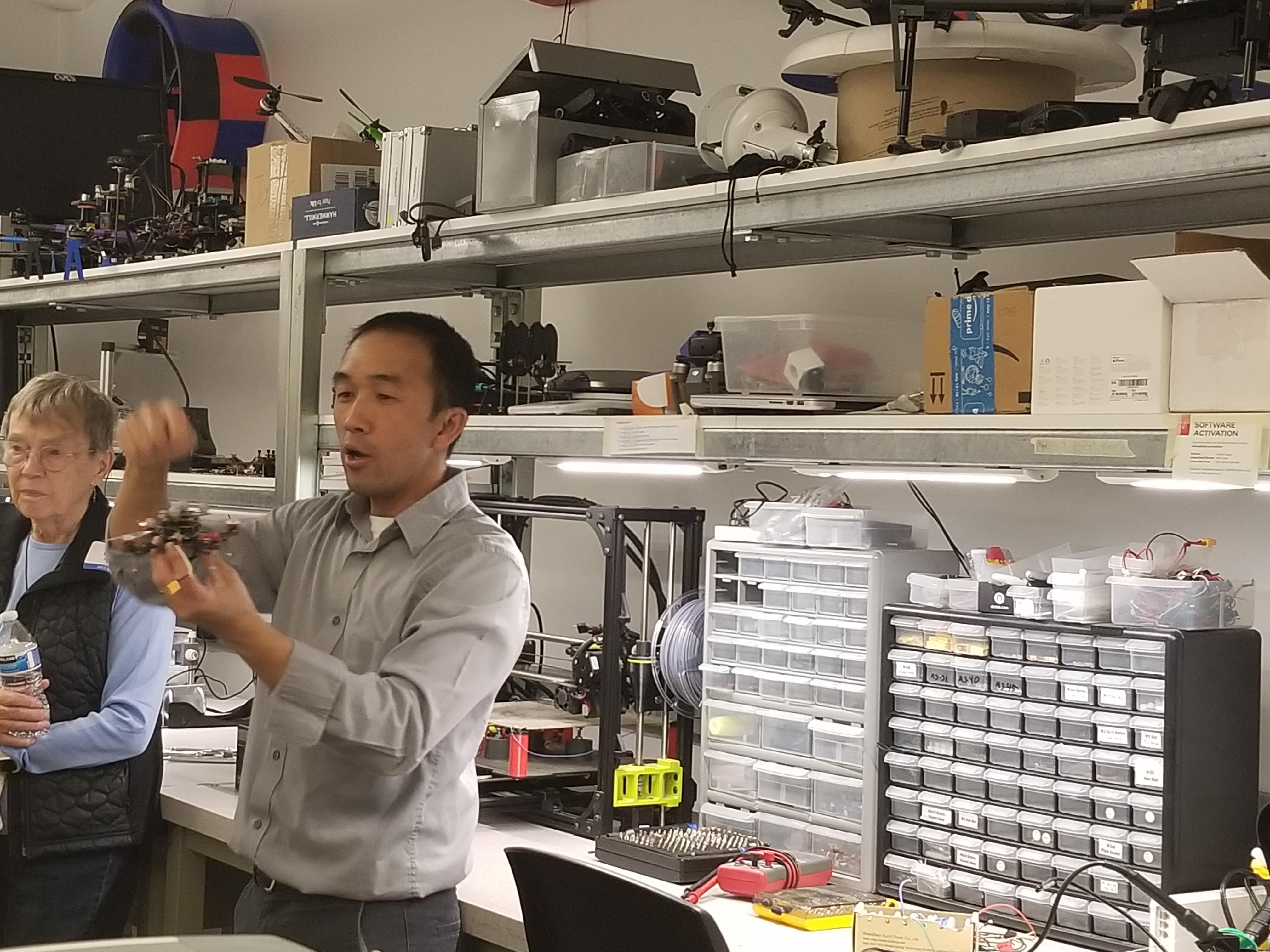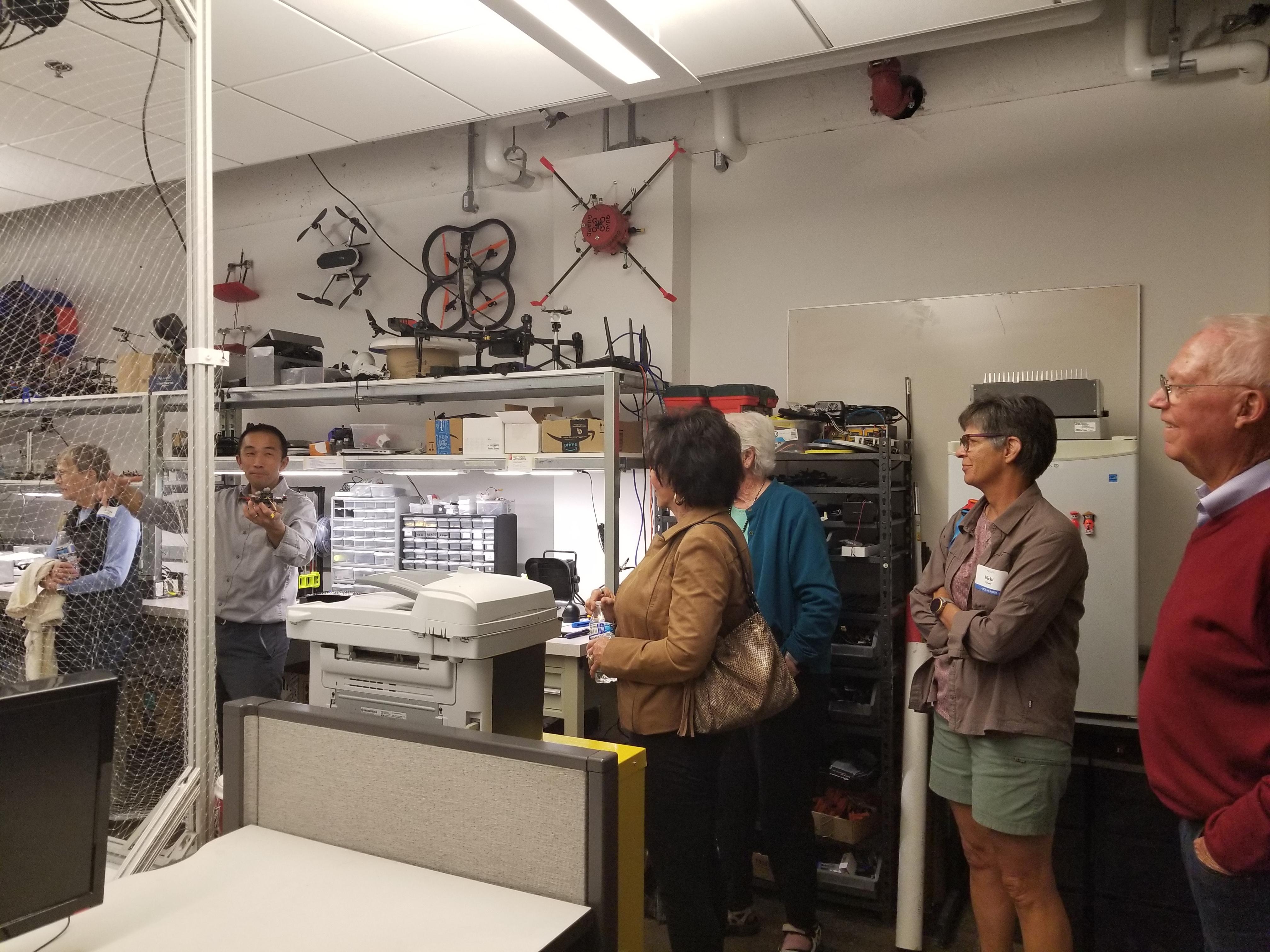 Dr. Kam Leang hosted ARCS members, guests, U of U Mechanical Engineering students and faculty for a talk on drones. Dr. Leang explained that over the last decade, drone technology has advanced significantly, due in part to innovations in small mobile devices including cell phones, tablets, and other personal electronics. Drones are now smaller, faster, and less expensive, and this trend is likely to continue. Although the term ‘drones’ has a negative connotation in many minds, the rapid increase in potential high-impact and game-changing non-military applications has attracted significant attention from the average do-it-yourselfer to tech giants that see the technology as disruptive. His talk highlighted key emerging applications for consumer drones, including drone-assisted emergency response and environmental monitoring, and it will highlight some of the challenges ahead and the technology’s impact on society and the quality of life. After the talk, Dr. Leang and his students took attendees on a tour of his lab and provided demonstrations of drones in action.
