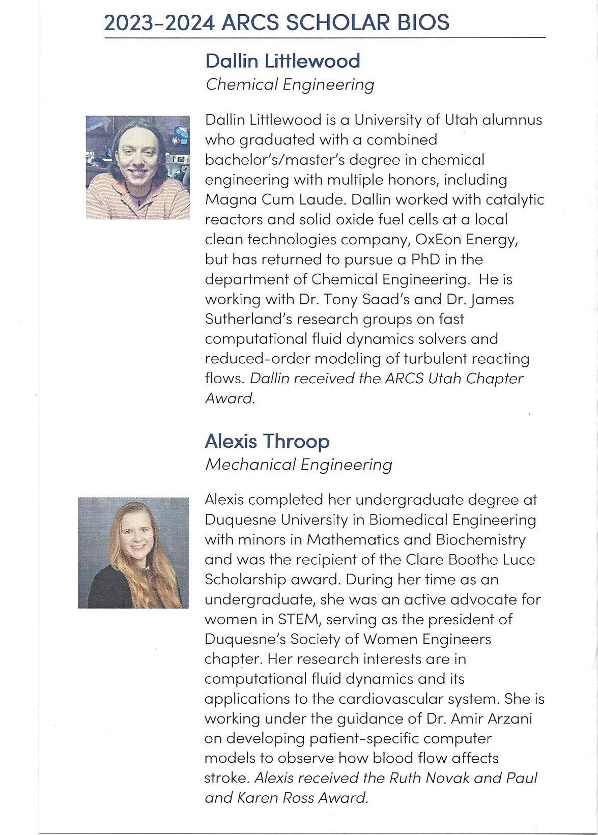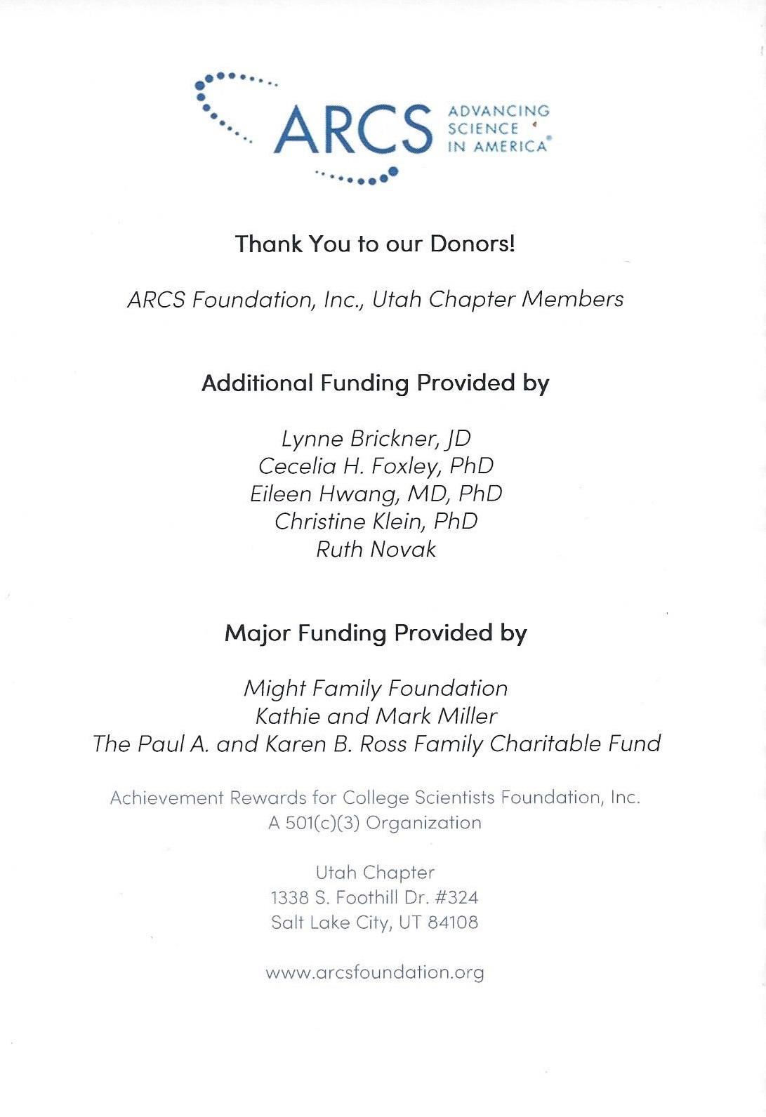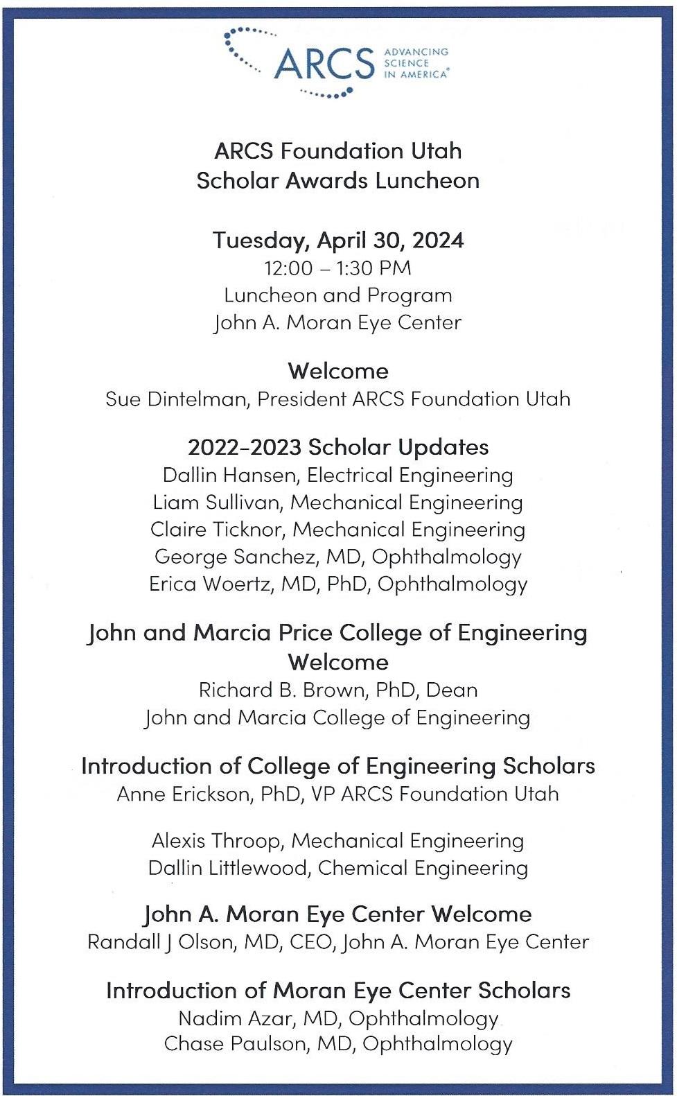 ARCS Members, Scholar Alumns, University Faculty and Staff gathered April 30, 2024 at the Moran Eye Center to recognize the 2023-2024 ARCS Scholars. Certificates and pins were presented to our newest scholars: Alexis Throop, Mechanical Engineering; Dallin Littlewood, Mechanical Engineering; Nadim Azar, MD, Ophthalmolgy; Chase Paulson, MD, Ophthalmology. The group also heard research updates from three of our 2022-2023 Scholars: Dallin Hansen, Electrical Engineering; Liam Sullivan, Mechanical Engineering; and Erica Woertz, MD, PhD, Ophthalmology. This year is also the 15th Anniversary of the founding of the Utah Chapter of ARCS Foundation, Inc. Sadly this anniversary coincides with the retirment of Dr. Rich Brown, Dean of the College of Engineering. Dr. Brown was recognized for his role in founding the chapter and his on-going support of ARCS. More pictures from the event may be seen here.
